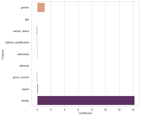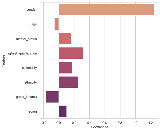 This graph indicates to us that apart from gender, none of our feature columns seemed to be very useful in determining our target. However, even gender is not as impactful as this makes it appear to be, as shown by the coefficient weights of our biased regression model: